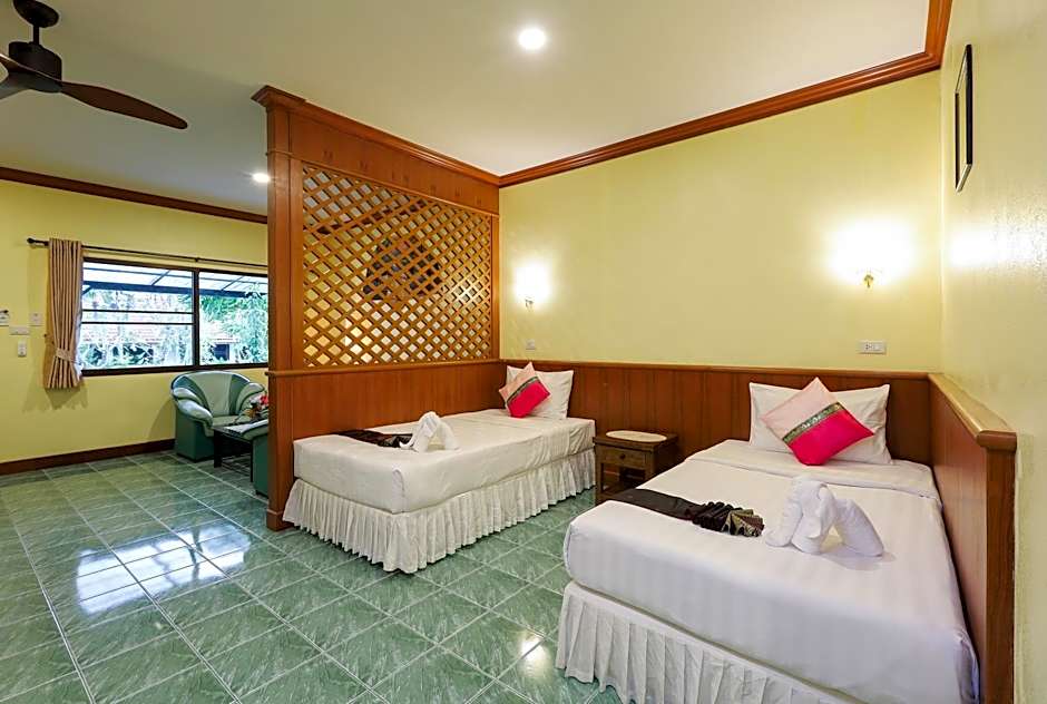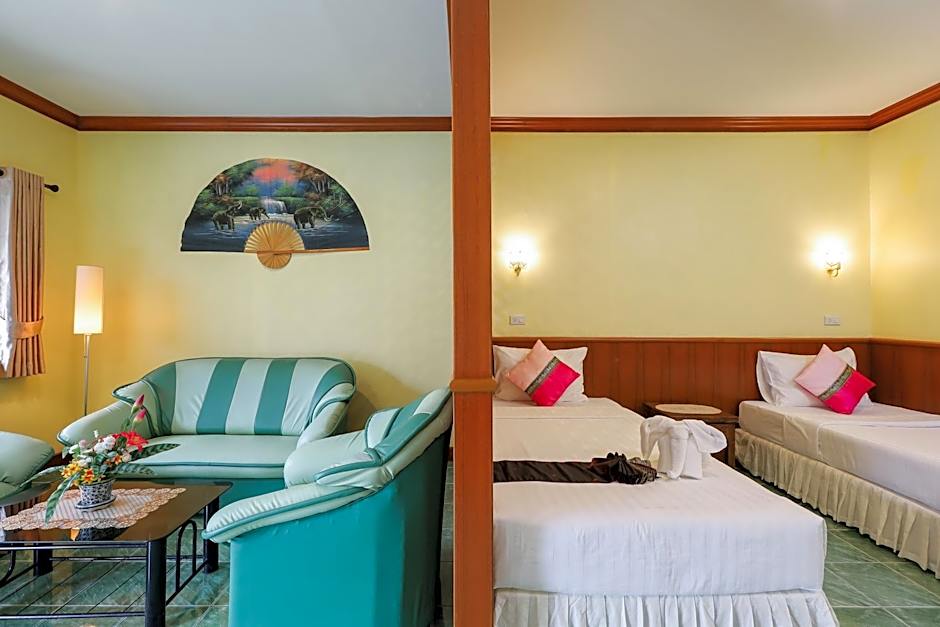 The family room features a sofa, a tiled floor, as well as a private bathroom featuring a shower. The air-conditioned family room offers a flat-screen TV, a tea and coffee maker, a wardrobe, a safe deposit box as well as garden views. The unit offers 3 beds.